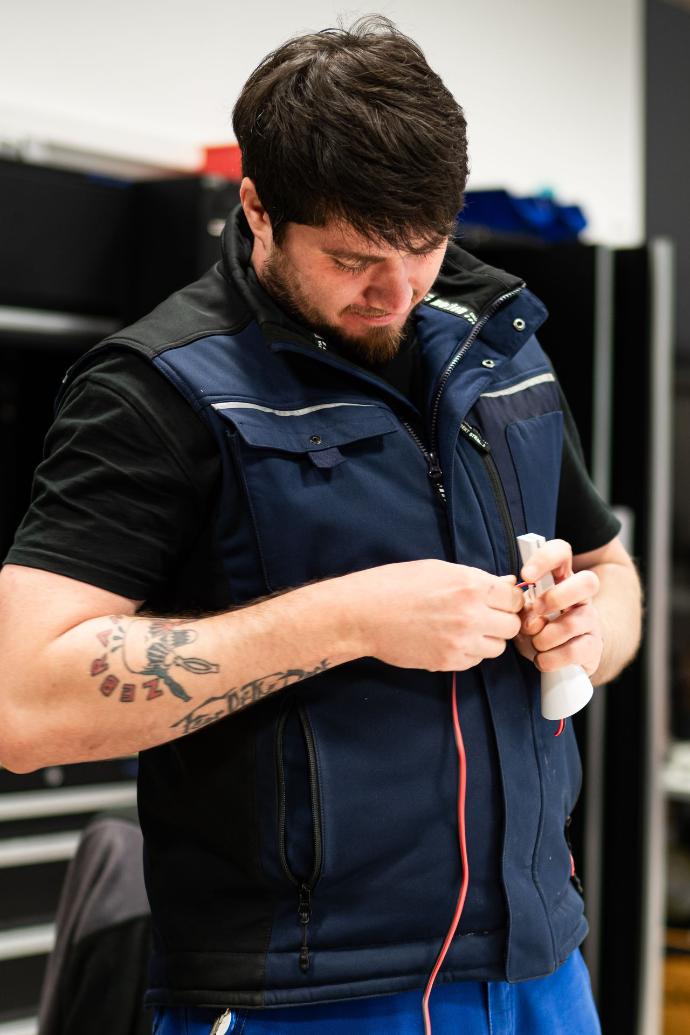 Now the finishing touches are in the capable hands of our all-rounder, who is equally in demand as a craftsman, electrician and janitor. He cuts, paints and wires the structure. At the same time, our apprentice uses our 3D printer to produce the stands that will later present the charging brackets.