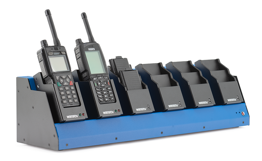 Die Tischladestationen gibt es in verschiedenen Ausführungen. Es können bis zu sechs Ladeschächte (auch unterschiedlichen Typs) installiert werden. Diese Version eignet sich für Einsatzleitstellen und ist für die handelsübliche Steckdose konzipiert.